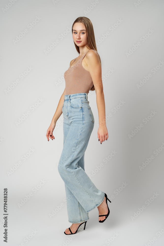 Young Woman Wearing High Rise Jeans and Tank Top posing on gray background in studio