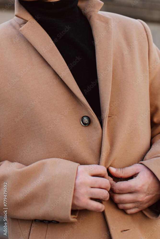 Street style fashion details of beige brown men's coat and black turtleneck. Classic street outerwear