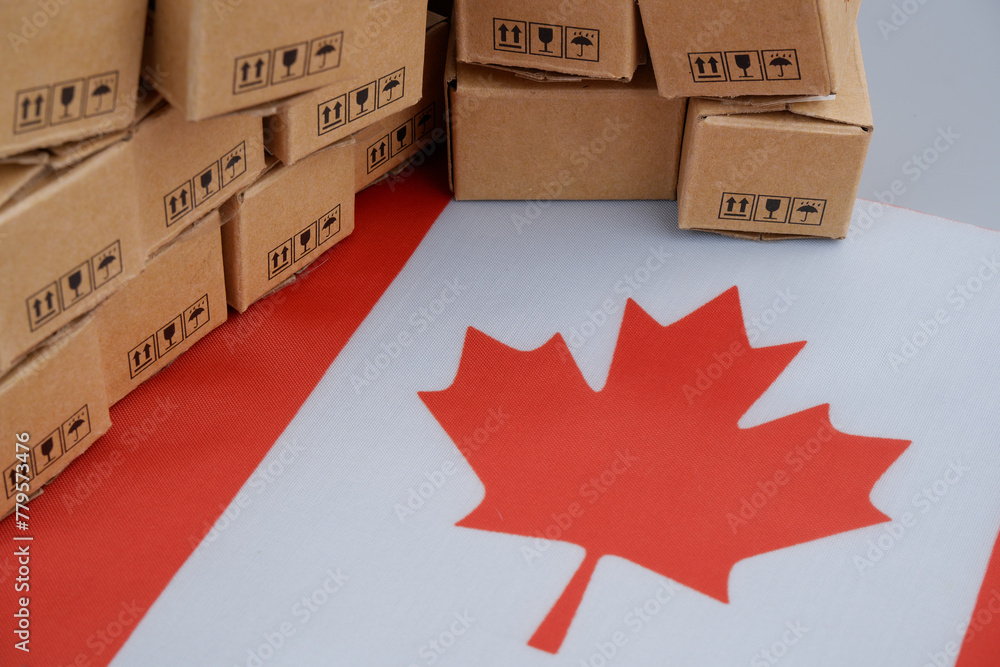 Canadian industry concept. Flag of Canada and many shipping carton boxes close-up.