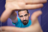 Young man doing frame using hands and fingers, isolated over purple background. High quality photo