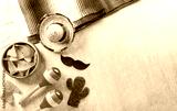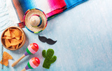Cinco de Mayo holiday background made from maracas, mexican blanket stripes or poncho serape and hat on blue background.