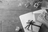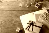 Nostalgic photos of wooden tables with dried flowers such as rose and sunflower, gift boxes with natural taste, notebooks, books, and clear glasses