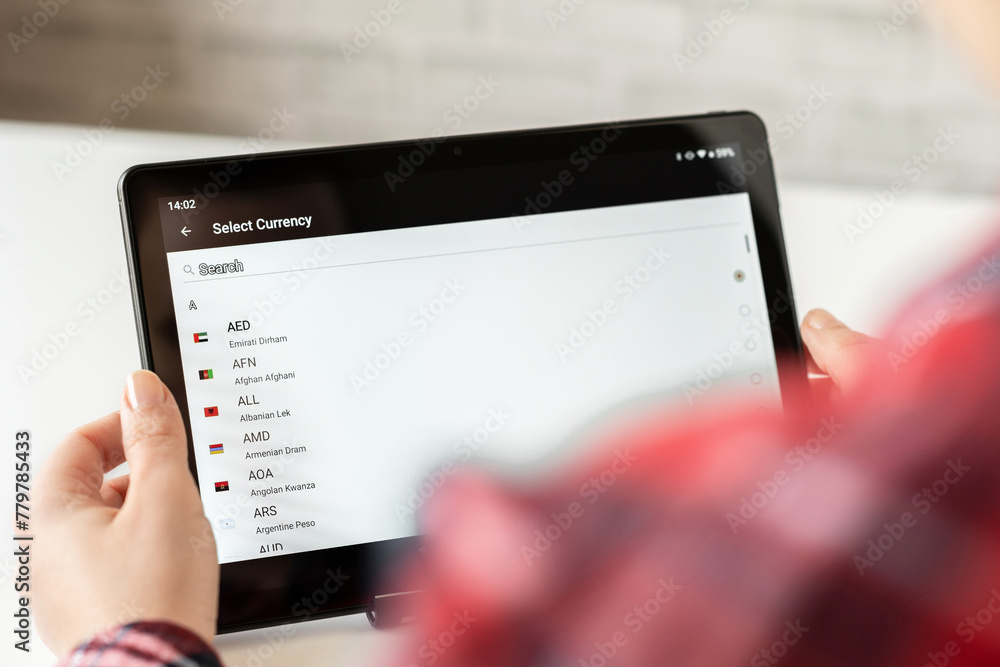 Woman finger of hand choosing foreign CHF, swiss franc currency from the list on the tablet for buying choosing online shopping, booking hotel