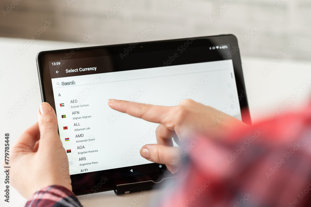 Woman finger of hand choosing foreign CHF, swiss franc currency from the list on the tablet for buying choosing online shopping, booking hotel