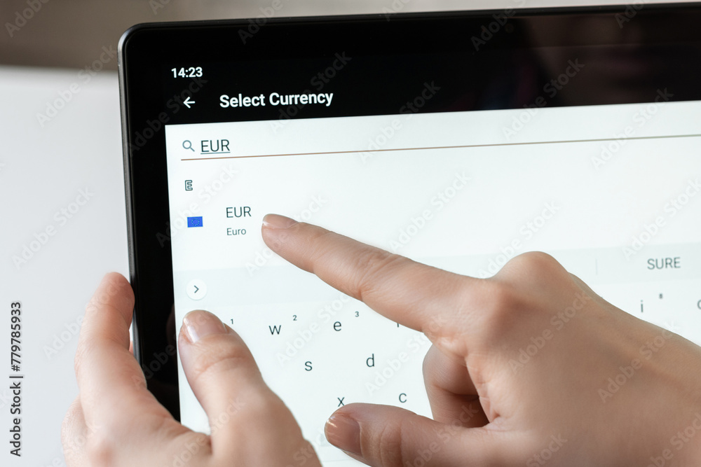 Woman finger of hand choosing foreign eur, euro currency from the list on the tablet for buying choosing online shopping, booking hotel