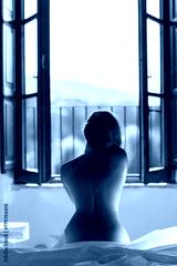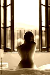 Naked young woman sitting on the retro bed on white sheet in the rustic room of countryside building in the summer. Back view