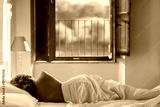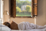 Naked young woman sleeping on the retro bed covering of white sheet in the rustic room of countryside building in the summer. Back view