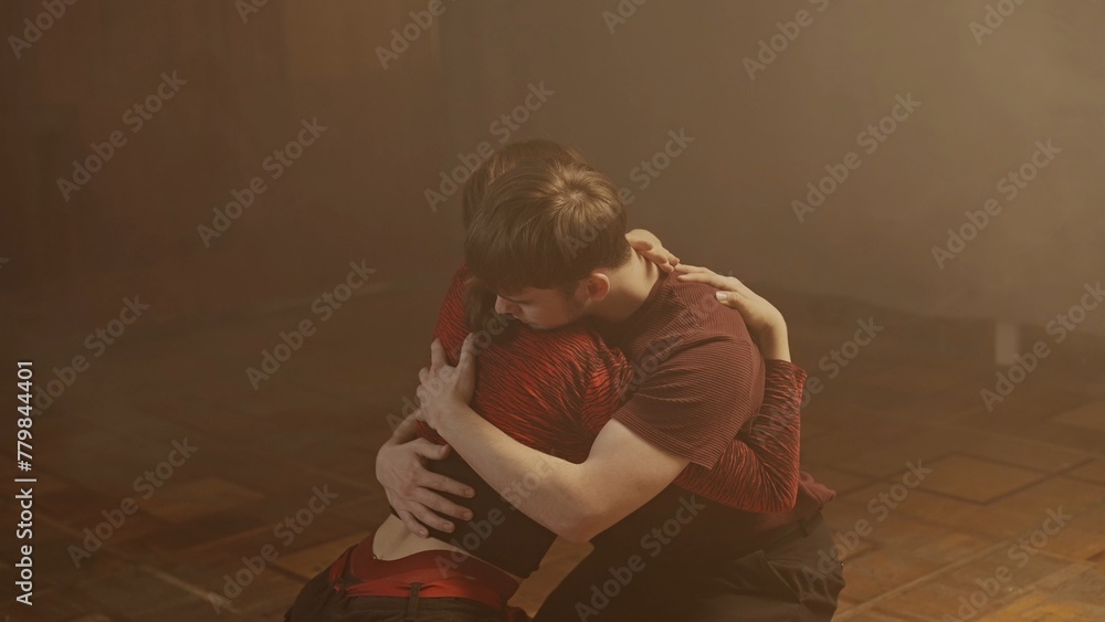 Professional dancers performing dance show. Young man and woman contemporary dancers perform modern choreography elements in smoke, middle shot.