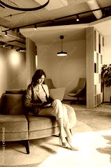 Sophisticated professional engrossed in her work at a modern cozy office lounge