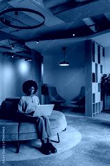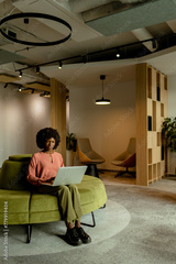 Radiant African American entrepreneur innovating at her modern workspace during a peaceful morning