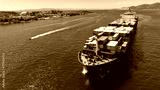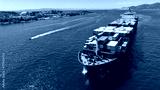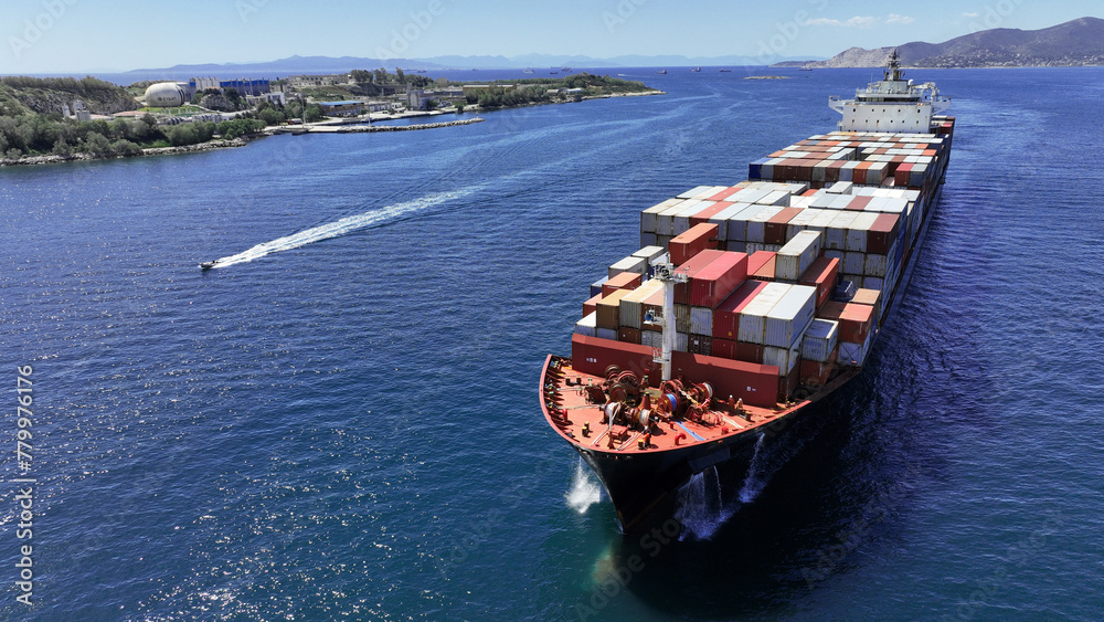 Aerial drone photo of huge fully loaded container tanker ship carrying truck size colourful containers in deep blue sea near Mediterranean terminal port
