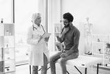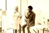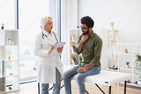 Bearded gentleman describing symptoms of illness to senior female doctor and gesturing hands. Mature elder physician giving recommendations and using notebook for writing prescription.