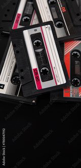 Close-up of many audio tapes. Analog storage medium. Cassettes for audio recordings and music. Vintage music back