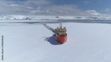 Icebreaker vessel navigating Antarctic waters - breaks through pack ice on its way. Aerial view. Featuring red color Laurence M. Gould Research Boat slicing through the Southern Ocean's ice expanse
