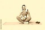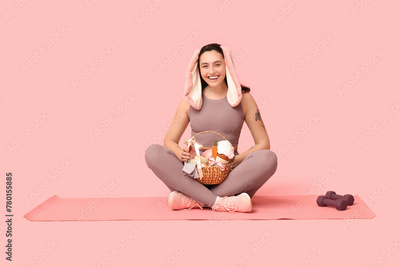 Happy female fitness coach in bunny ears with Easter basket and dumbbells on pink background