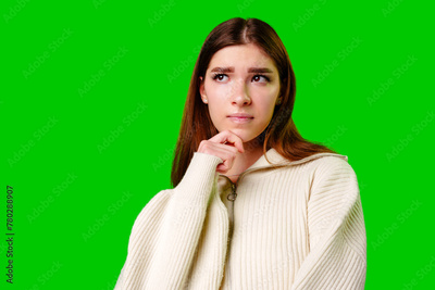 Young Woman Deep in Thought Against a Green Screen Background