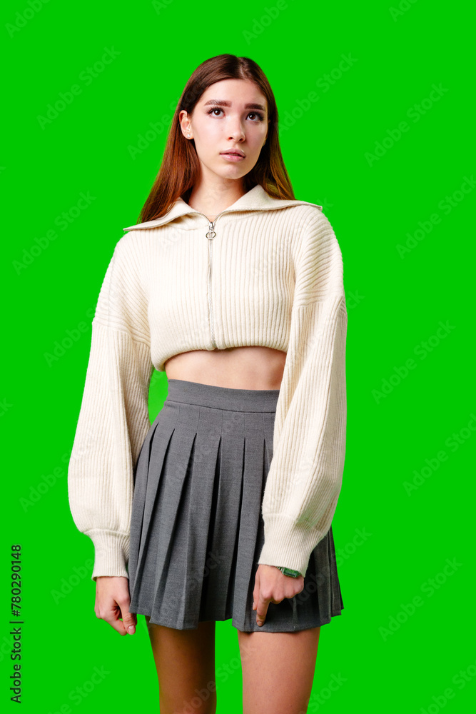 Young Woman in White Sweater and Grey Skirt Posing on Green Background