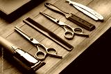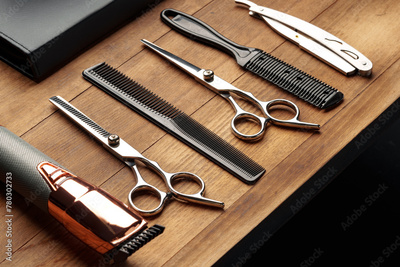 Professional Barber Tools Laid Out on Wooden Surface for Mens Grooming Session