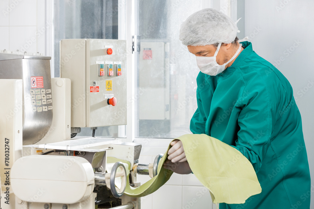 Chef In Protective Workwear Processing Spaghetti Pasta Sheet