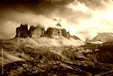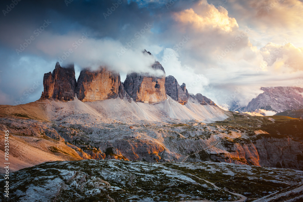 A mighty rocky massif Tre Cime di Lavaredo (Drei Zinnen). Italian Alps, Sexten Dolomites, South Tyrol, Europe.