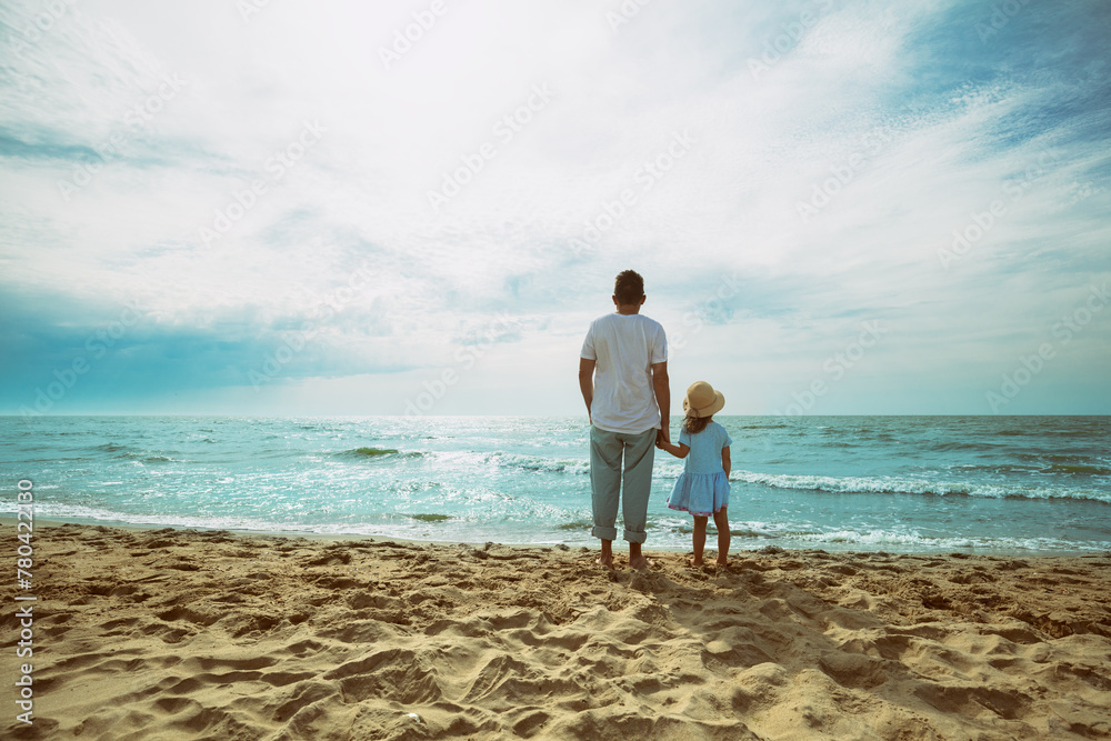 A father walks with his little daughter along the beach in the evening, looking at the sunset. Happy childhood and Father's Day concept