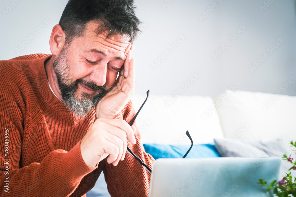 Tired sleepy mature freelancer man sitting on sofa at work laptop and touching glasses. Overwork and overtime small business online. People using too much computer laptop. Home office business