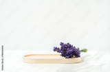 Elegant cosmetics product presentation with beige podium and lavender flower on white background. Ideal for showcasing beauty and cosmetics products. Soft focus background.