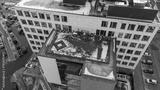 Drone photography of rooftop terrace in office building covered by snow during winter day