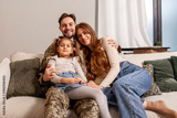 Ukrainian military man in camouflage uniform hugs his family at home and smiles, a happy soldier of the Ukrainian army returned home and sits on the sofa with his wife and daughter, mobilization
