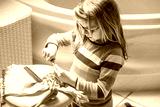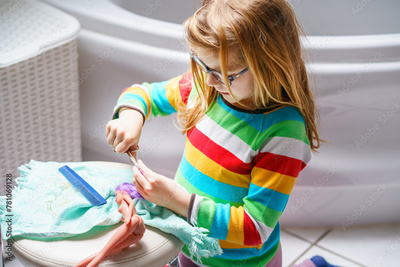 Cute little girl playing with doll at home. Child with eyeglasses making haircut to her toy doll. Indoor creative activities for children