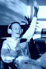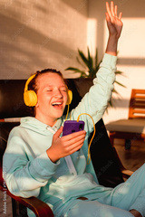 Beautiful young woman in headphones sits on sofa and enjoys listening to music