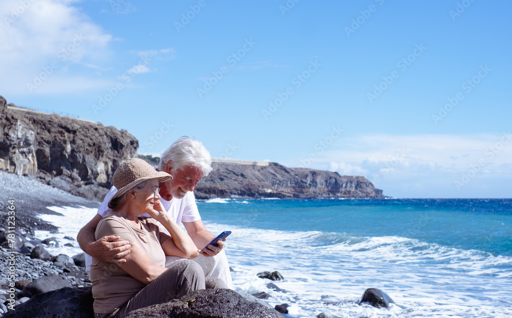 Relaxed senior couple in vacation sitting on the seashore looking smartphone while waves splashing on the beach enjoying retirement lifestyle and freedom, horizon over sea