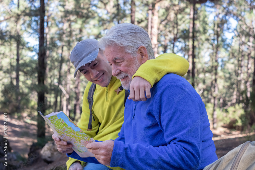 Young grandson and old grandfather consulting trail map while hiking in mountain forest enjoying nature and healthy activity. The new and old generation share the same passion. Adventure has no age