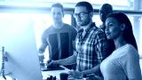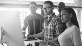 Four diverse entrepreneurs stand around a work table and work together on a project on the computer. They all look focused on the computer screen