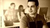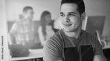 Athletic business man sits with his arms crossed, smiling while his diverse colleagues stand in the background and look at a computer screen.