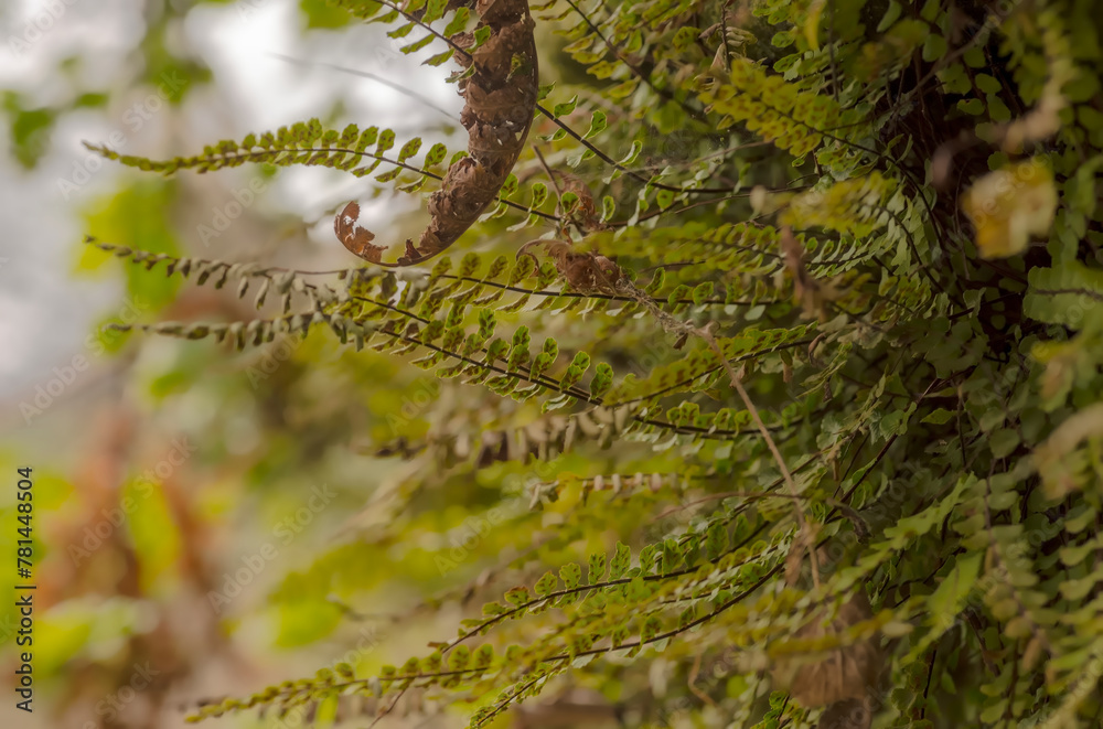 Paproć na skale. Paproć z drobnymi liśćmi. Pionierska roślina rosnąca na skale w niezwykle trudnych warunkach.