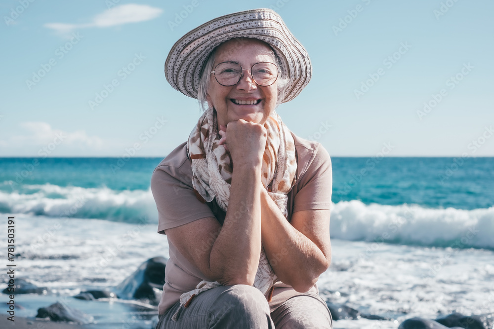 Senior bearded smiling man sitting on sofa with laptop while using mobile phone - indoor, at home concept - caucasian elderly retired man enjoys tech and social