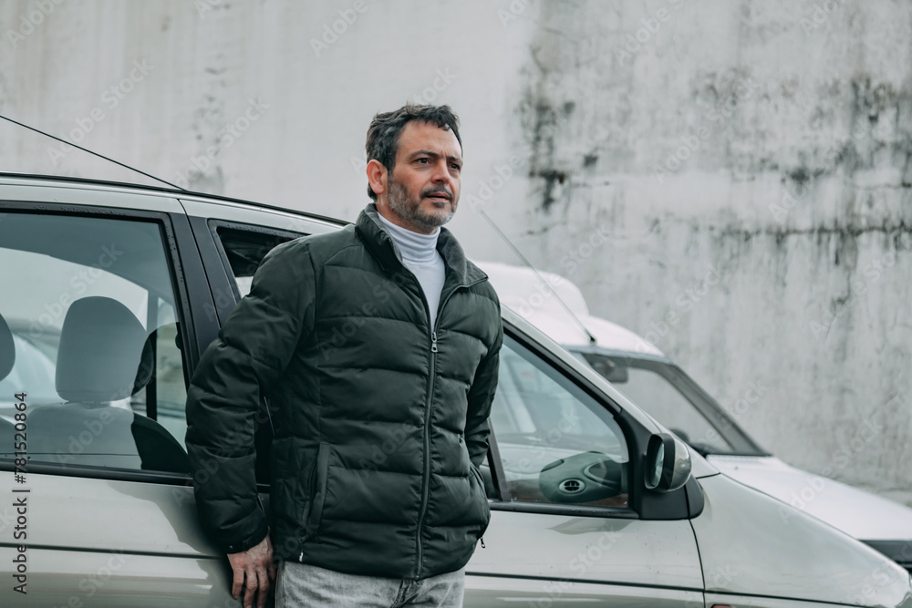 middle aged man posing in front of car