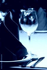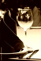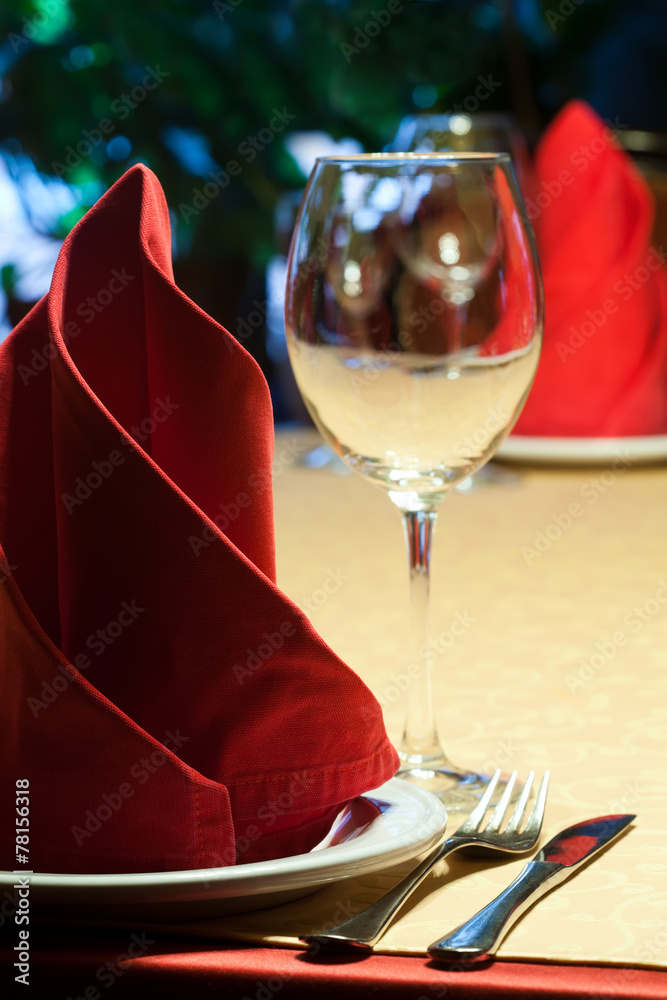 Table in a restaurant with tablecloth, napkins, wine glasses