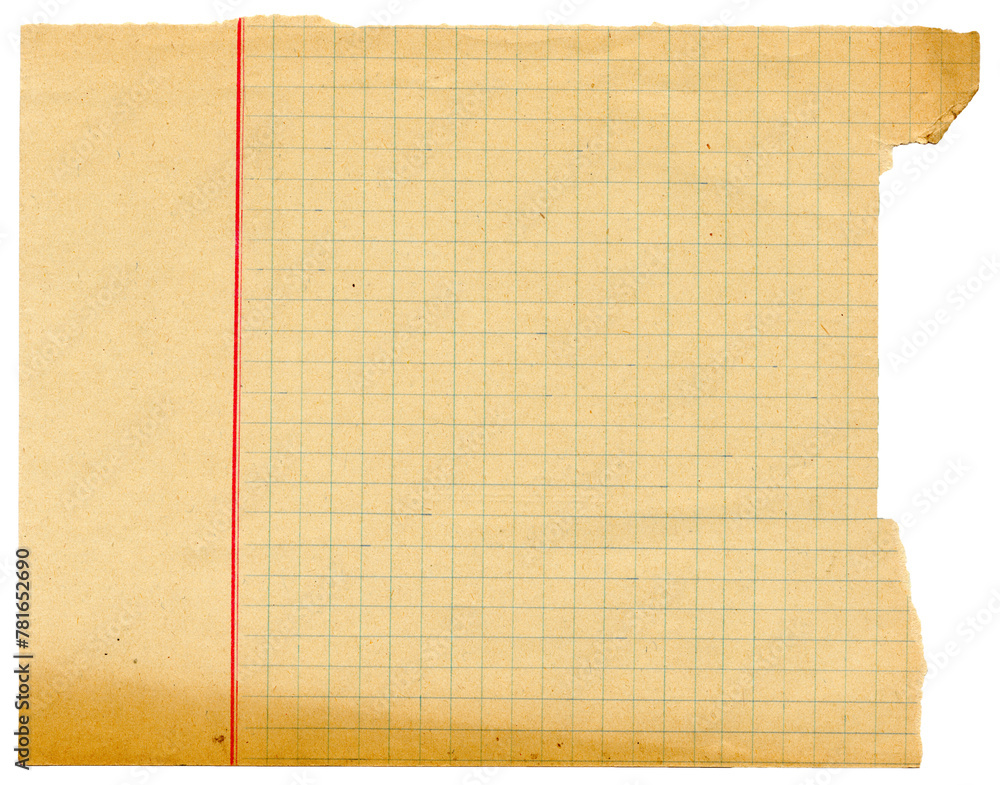 Alter Zettel Notizzettel - karriert, roter Rand und Kästchen vergilbt - Stück aus einem alten Schulheft
