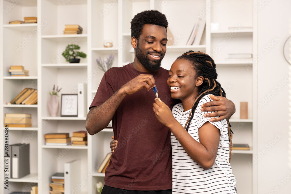 African American Couple Sharing a Joyful Moment at Home With Key, Embodying Feelings of Happiness, New Homeownership, and Togetherness Against a Backdrop of Bookshelves.