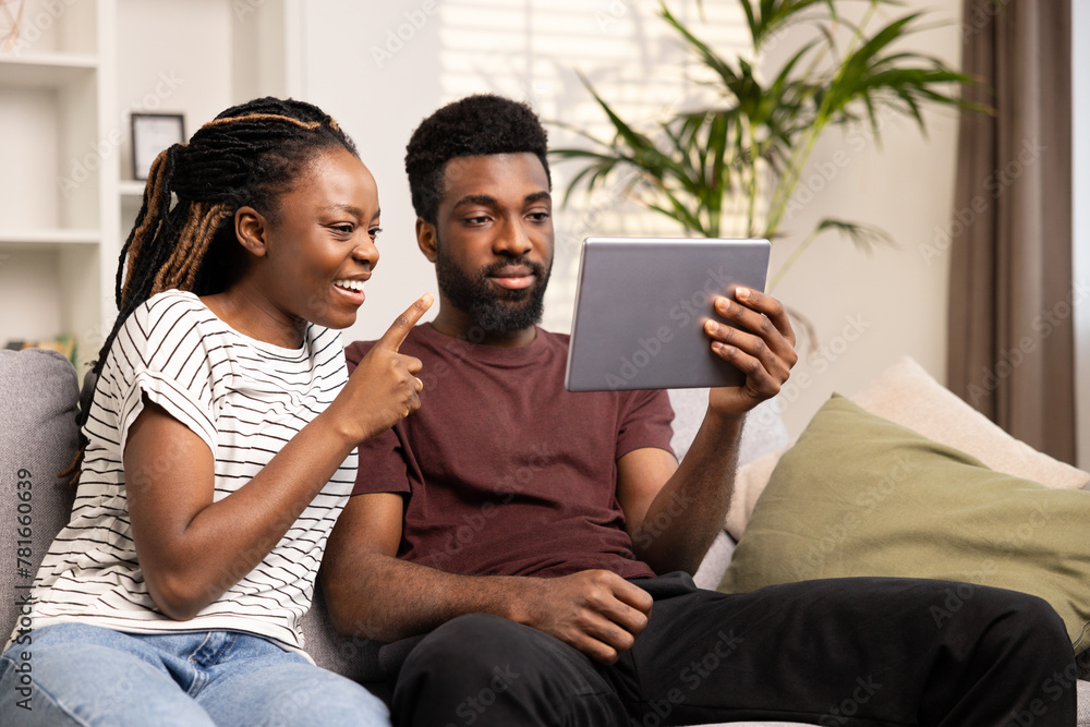 Couple Enjoying Digital Tablet Technology Together At Home. Smiling Young Woman Pointing At Screen While Relaxed Man Holds Tablet. Indoor Leisure, Loving Relationships, And Modern Lifestyle Concept.