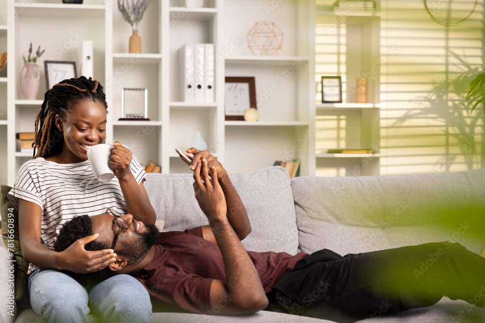 Happy Couple Relaxing at Home with Coffee, Candid Moment of Joy and Affection, Cozy Living Room