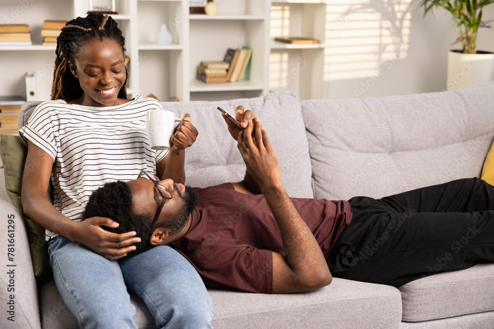 Happy Couple Relaxing On Couch, Woman Laughing Holding Coffee, Man Lying Down Enjoying Smartphone, Cozy Home Setting
