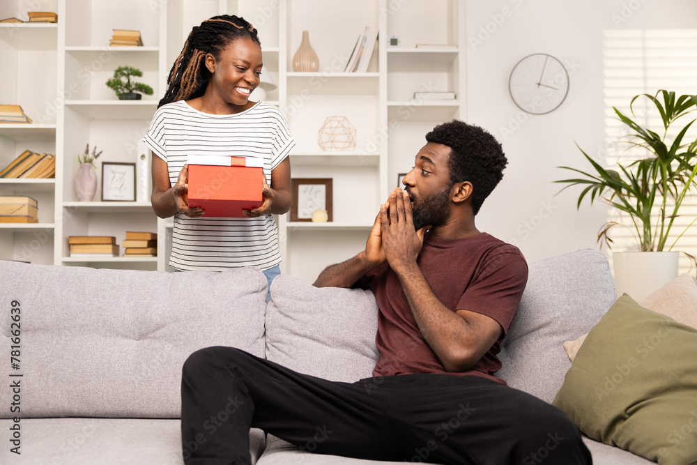 Surprised Man Receiving Gift From Woman At Home. Joyful African American Couple Sharing A Happy Moment With A Present. Excitement, Celebration, And Relationship Concept.