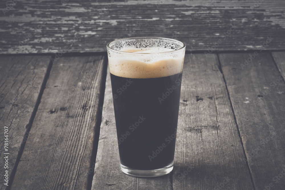 Pint of Dark Beer on Wood Background with Vintage Film Style
