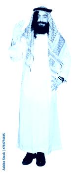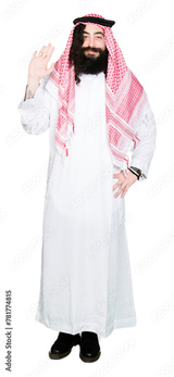 Arabian business man with long hair wearing traditional keffiyeh scarf Waiving saying hello happy and smiling, friendly welcome gesture