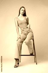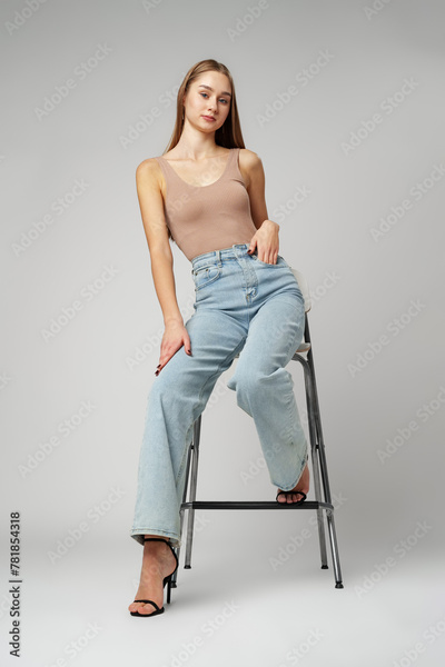 Young Woman Sitting on Stool in High Rise Jeans on gray background