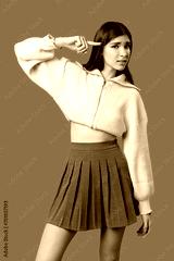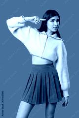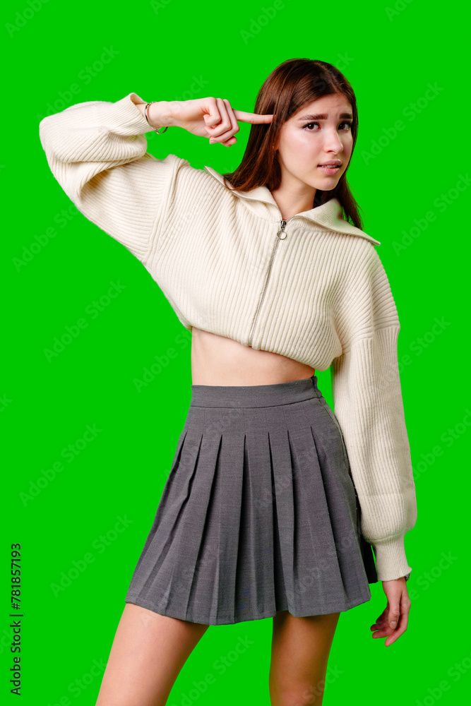 A young woman stands against a vivid green background, exhibiting a confident attitude with one hand behind her head.