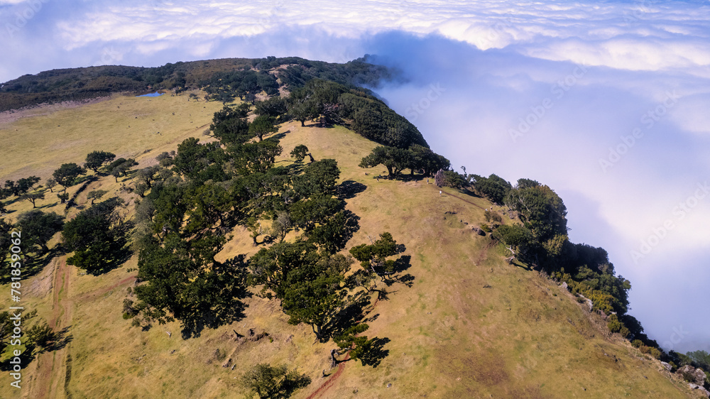 The majestic laurel tree rising from a green field in Madeira. The tree is tall and sprawling, with its dense leaves forming a green canopy over the ground.